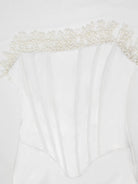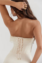 Gabriella är en klänning att behålla för alltid – en av våra mest exklusiva och lyxiga skapelser. Den axelbandslösa silhuetten pryds av en handbroderad kant med rader av pärlor och glaspärlor som faller mjukt längs bysten.