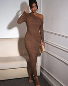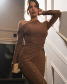 Stråla i ren elegans med denna asymmetriska maxiklänning med enaxlad design. Det lätt stretchiga glittriga tygetformar sig smickrande efter kroppen och framhäver dina naturliga former med stil. Perfekt för särskilda tillfällen som galor, bröllop eller eleganta middagar.